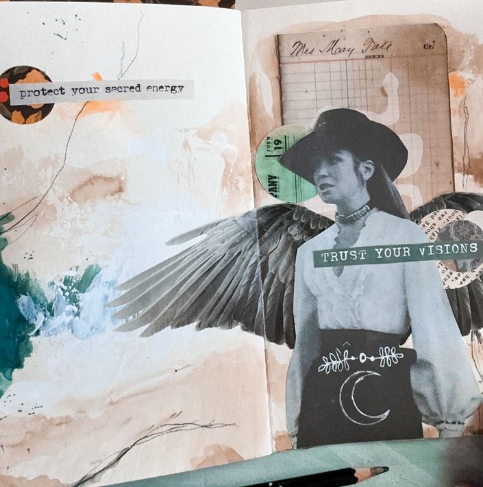Doing art with Jesse is never just a project, it is an exploration. Each video or class is a dialogue where she invites you to play, create and learn more about yourself. The prompts in Curiouser and Curiouser each invited me to consider questions about what I wanted, what I needed and who I was at that moment. Each page of my finished journal tells a story of me. And like Alice, I fell into a rabbit hole and when I came out the other side I had learned more about myself.